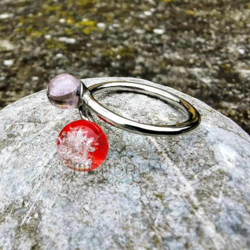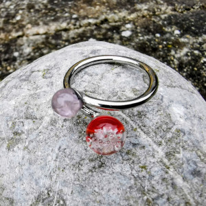 Menší kulička je jemně průhledná, v odstínech světle růžové až lehce fialkové, něžná a klidná, jako dotek soumraku na kůži, jako tiché „ano“, které zjemňuje každý pohyb.