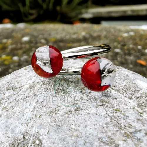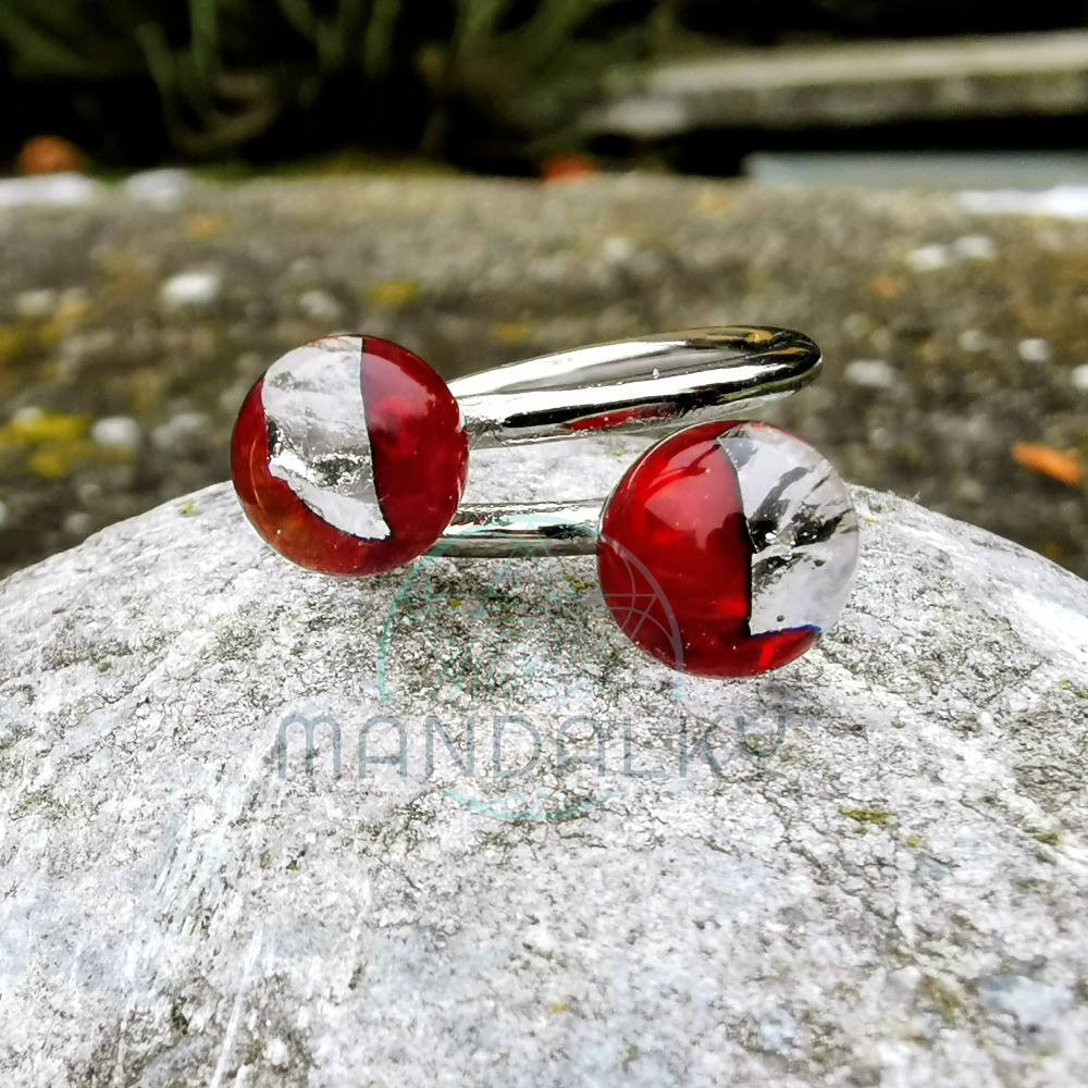 Skleněné kuličky jsou sytě červené, v průhledném skle ukrývají plátek stříbra — jako žhavé srdce s jiskrou uvnitř, jako plamen, ve kterém se zrcadlí měsíc.
