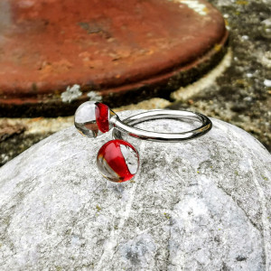 Tento prstýnek je jako oheň, který v sobě nese světlo. Nerezová šína drží dvě skleněné kuličky, které jsou si podobné, a přesto každá nese svůj vlastní odlesk.