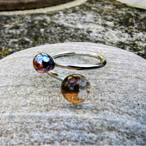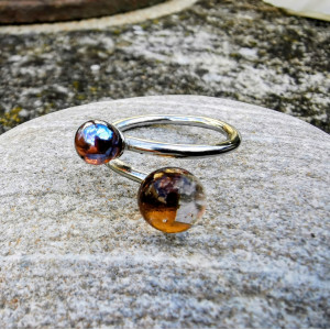Tento prsten je setkáním dvou živlů, které spolu nehlučně tančí. Jemně vedená šína z nerezového materiálu nese dvě skleněné kuličky — oranžovou se stříbrnými odlesky, jiskřivou jako ranní slunce na kůži, a temně modrou, hlubokou jako noční ticho a nekonečná voda pod hvězdami.