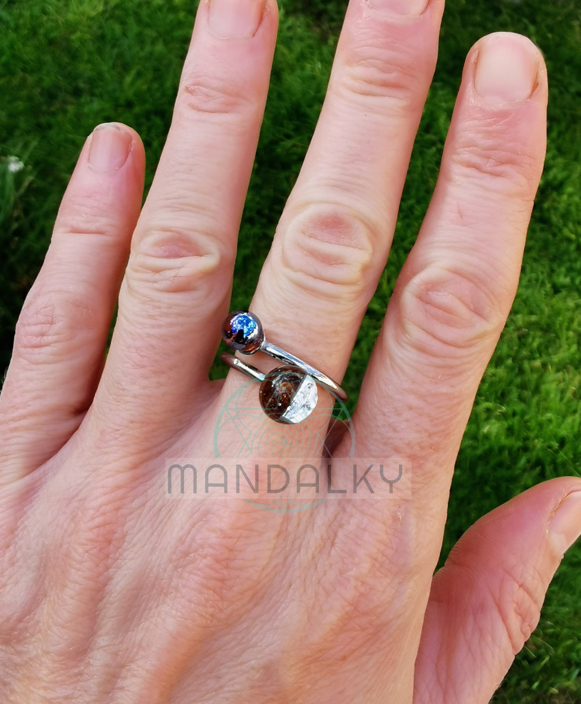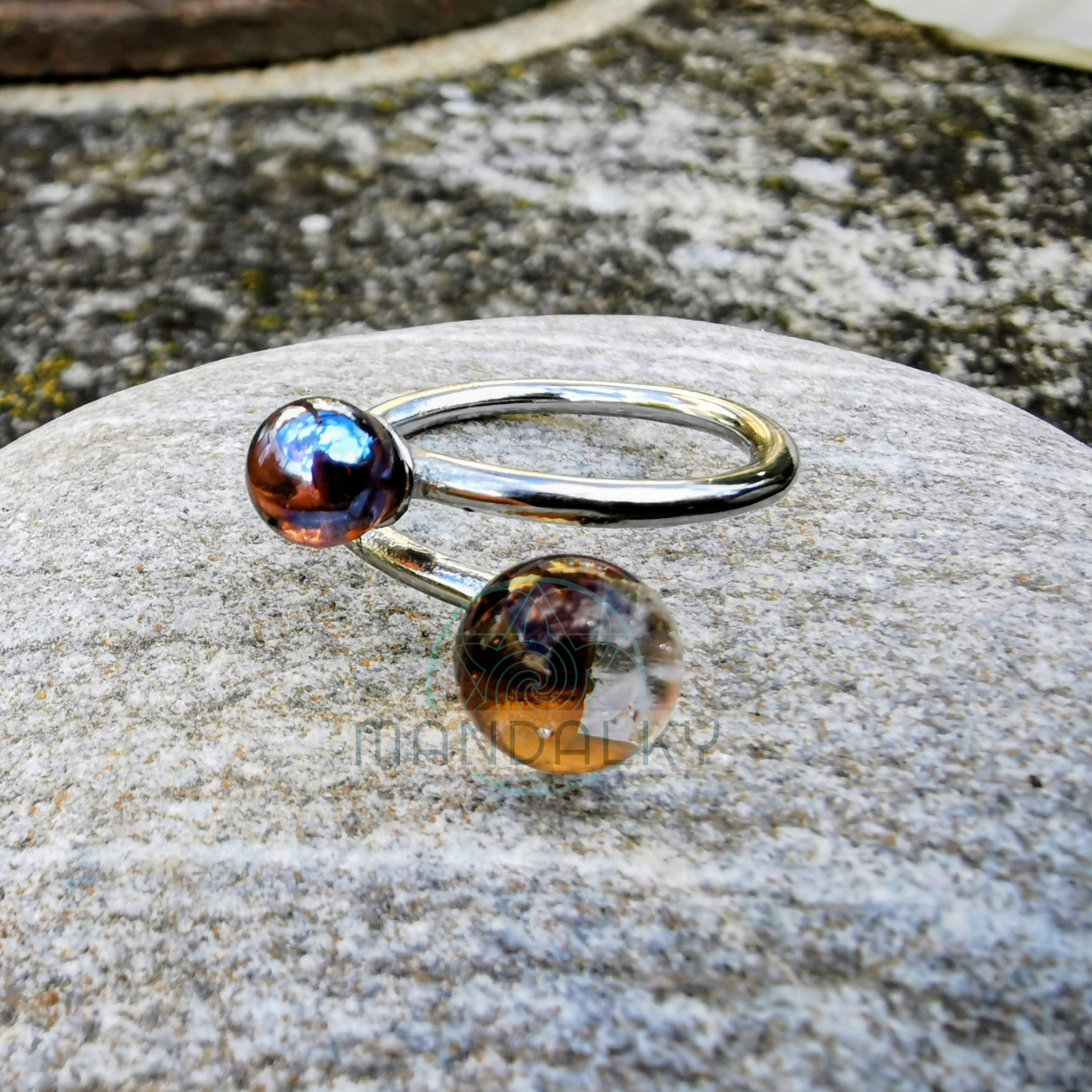 Tento prsten je setkáním dvou živlů, které spolu nehlučně tančí. Jemně vedená šína z nerezového materiálu nese dvě skleněné kuličky — oranžovou se stříbrnými odlesky, jiskřivou jako ranní slunce na kůži, a temně modrou, hlubokou jako noční ticho a nekonečná voda pod hvězdami.