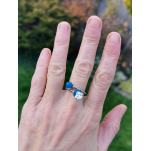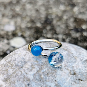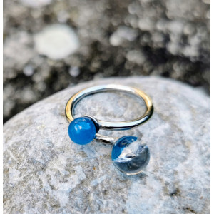 Tento prsten je jako tiché jezero pod ranním nebem. Nerezová šína jemně objímá dvě středně modré kuličky — jedna čistá a klidná jako hladina bez větru, druhá v sobě ukrývá stříbrný plíšek, jako odraz světla na vodní hladině, jiskru, která připomíná, že i v tichu může něco jemně zářit.