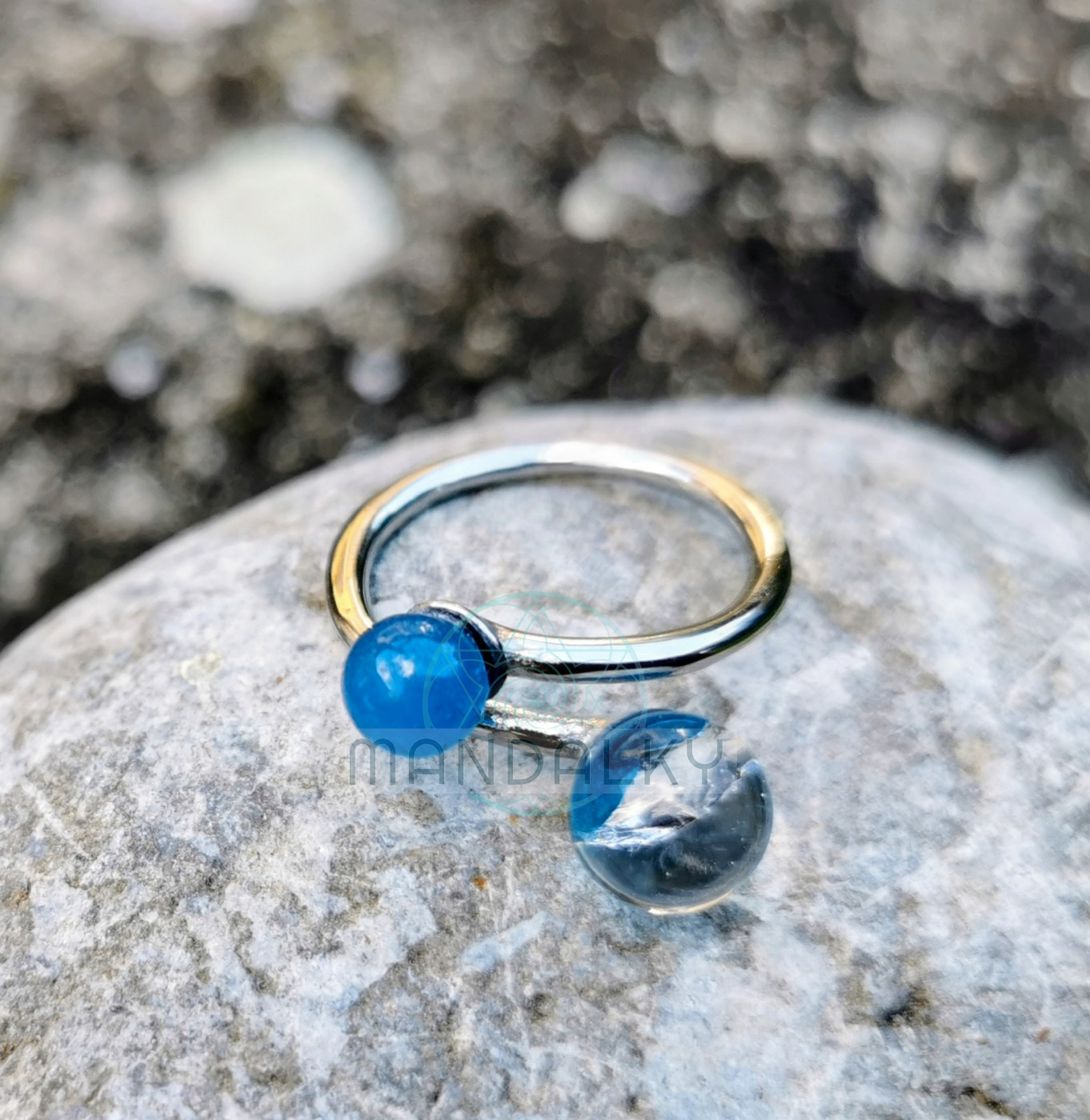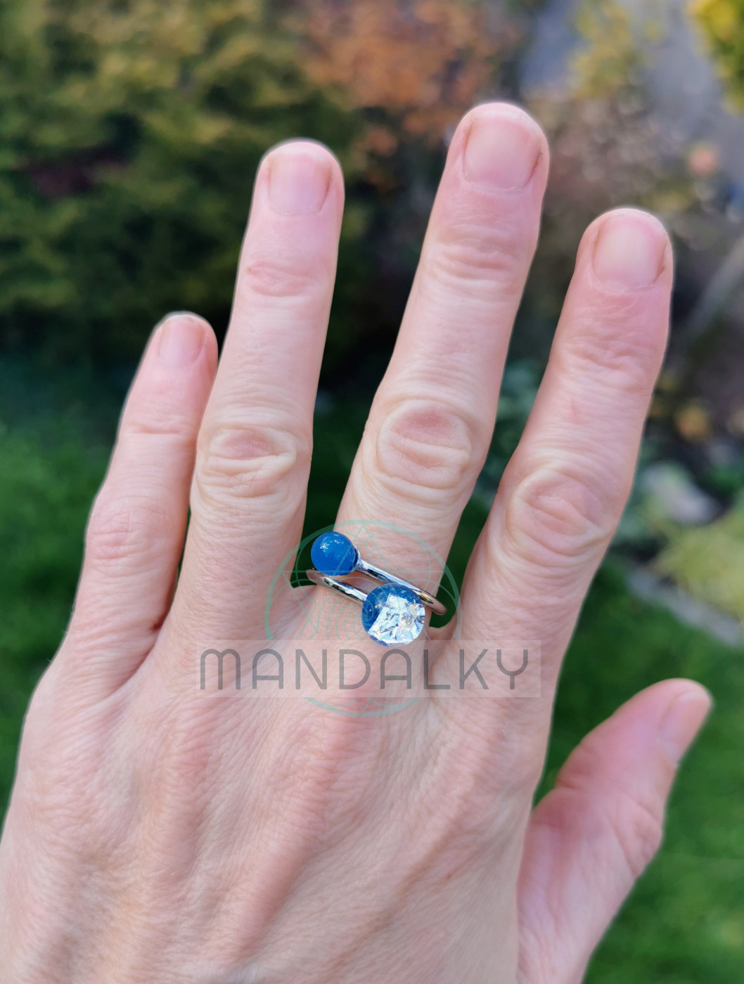 Tento prsten je jako tiché jezero pod ranním nebem. Nerezová šína jemně objímá dvě středně modré kuličky — jedna čistá a klidná jako hladina bez větru, druhá v sobě ukrývá stříbrný plíšek, jako odraz světla na vodní hladině, jiskru, která připomíná, že i v tichu může něco jemně zářit.