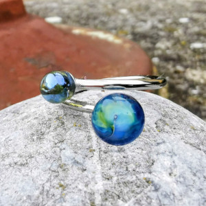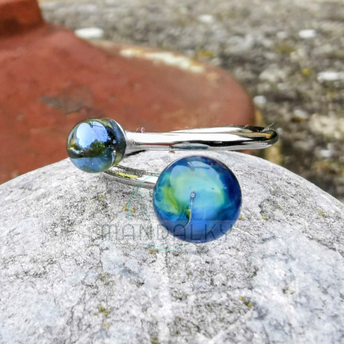 Menší kulička je modře kovově průhledná, chladivá a jemná, jako vesmírný prach nebo tichý stín planety v kosmu. Dodává hloubku a kontrast, zdůrazňuje detaily větší kuličky a působí minimalisticky a elegantně.