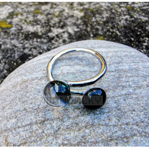 První kulička je hluboce černá, ale uvnitř, pod průhledným povrchem, se blyští kousek stříbra — jako skrytá hvězda v temnotě, jako tajemství, které se nezjevuje každému.