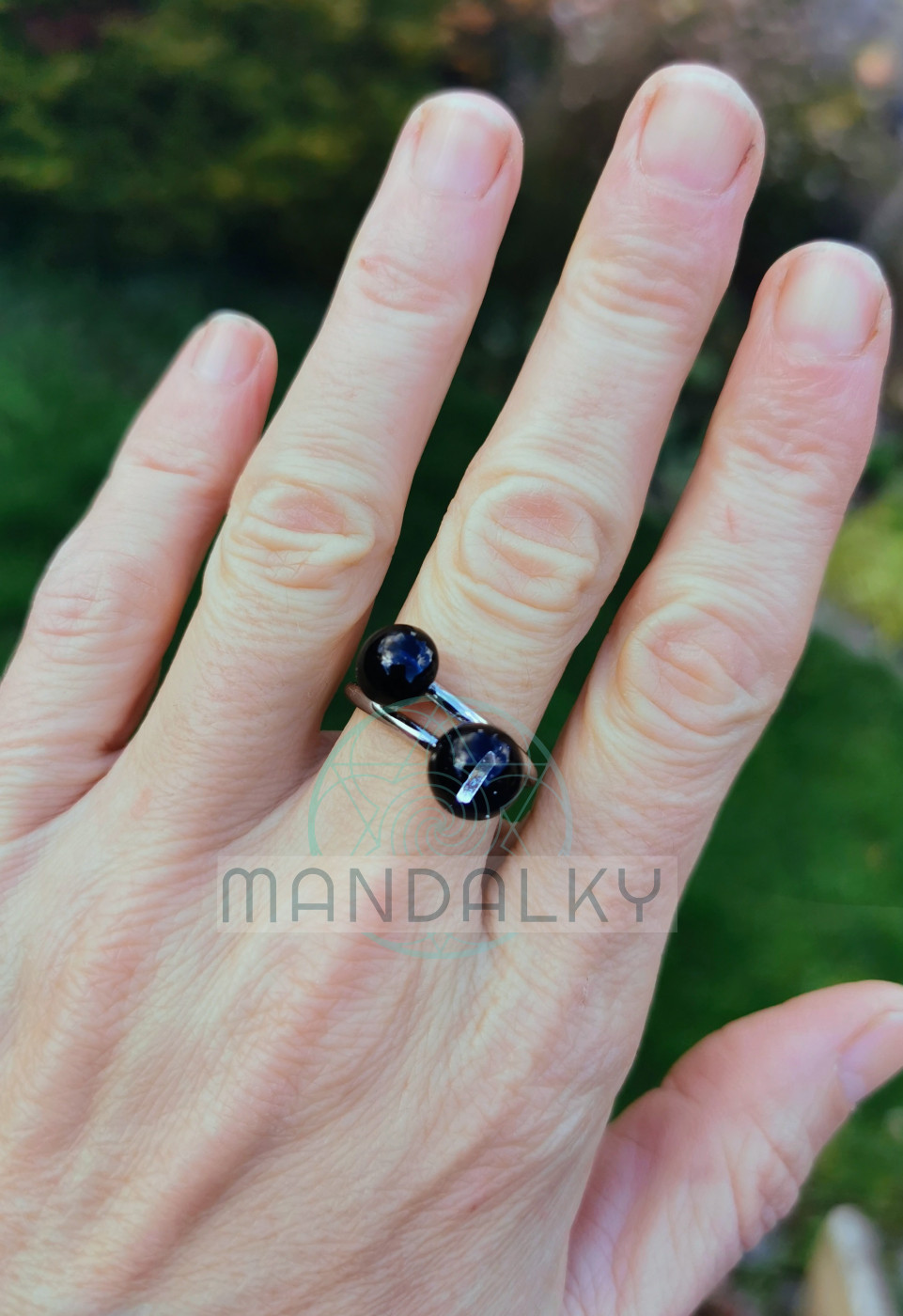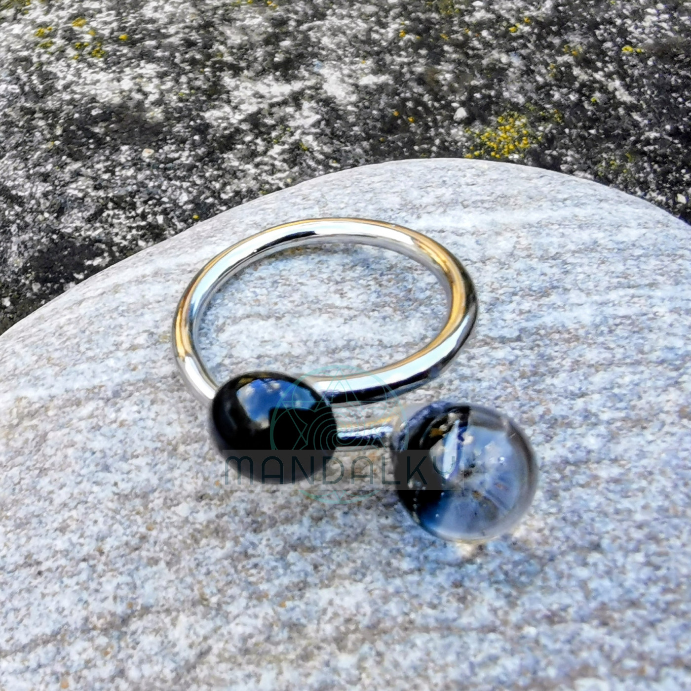 Tento prsten nese energii tajemství a ticha, které má svou vlastní sílu. Nerezová šína je čistá a pevná, jako hranice mezi světlem a nocí, a na ní dvě kuličky — každá jiná, a přesto jedna duše.