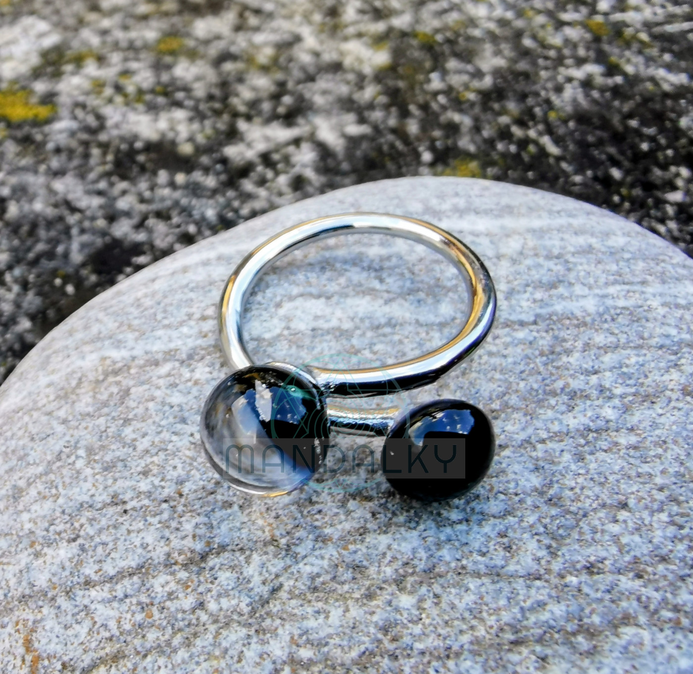 První kulička je hluboce černá, ale uvnitř, pod průhledným povrchem, se blyští kousek stříbra — jako skrytá hvězda v temnotě, jako tajemství, které se nezjevuje každému.