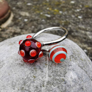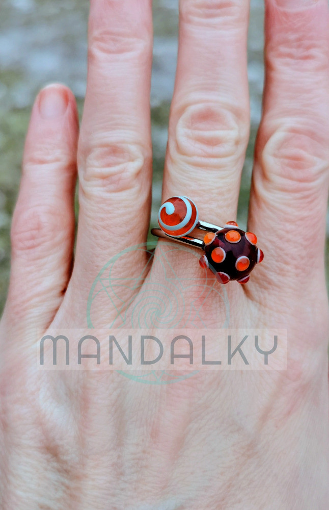 Menší kulička je sytě červená, překrytá průhledným sklem, a uvnitř se vine světle modrá spirála — jako chladivý sen v horkém srdci, jako vesmírná stopa v ohni.