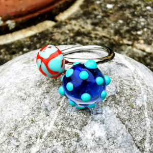 Větší kulička je tmavě modrá, hluboká jako noční moře, a na jejím povrchu se třpytí průhledná vrstva s tyrkysovými vystouplými puntíky — jako bubliny světla stoupající z hlubin, jako kapky radosti na temné vodní hladině.